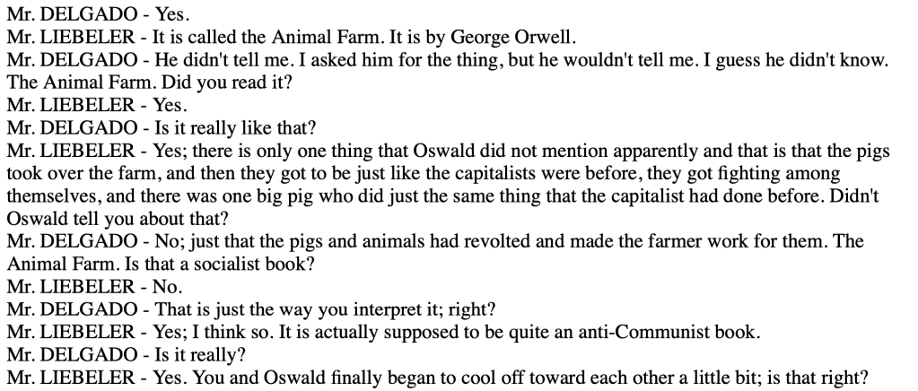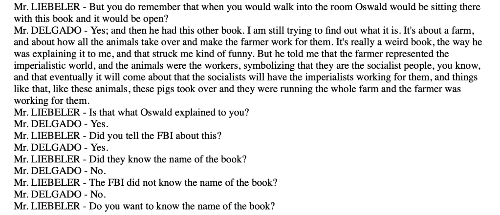 Five: He didn’t understand the point of Animal Farm. At least that is what Gus Russo and Wesley Liebler led us to believe. Well, maybe Oswald did understand the point of Animal Farm but was only giving his fellow Marine, Nelson Delgado, a short synopsis of the anatomical plot points. Here is what Nelson Delado had to say.