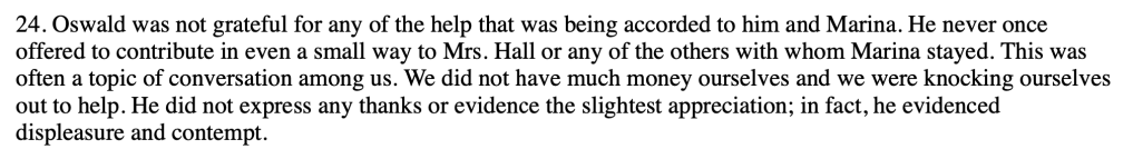 Nine: He wouldn’t let Marina learn English. I suppose that’s why they hooked up with Ruth Paine, who was looking to improve her Russian. She and Marina hooked up so that Ruth could improve her Russian while Marina improved her English. Buddying up with a counterpart is a well known technique in language acquisition. Since Lee was opposed to Marina learning English, I suppose that’s why he broke off his friendship with George D. who loaned Marina records to improve her English.