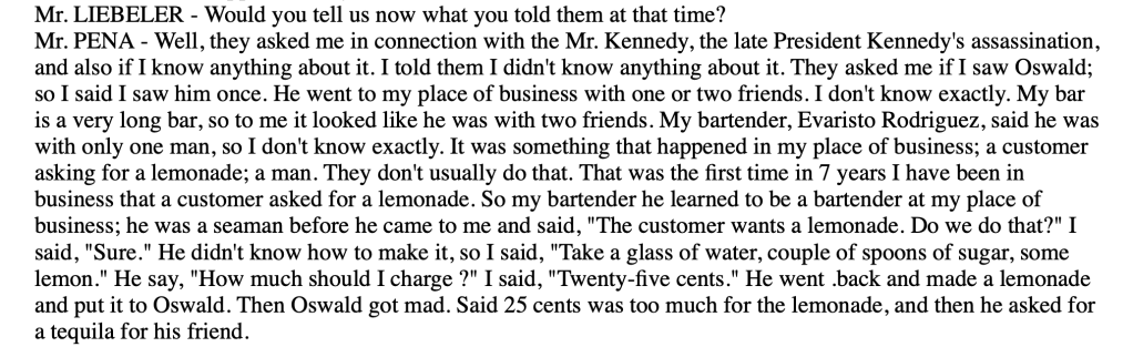 Four: He drank lemonade in a bar. It’s true. Look here. Orest Pena tells us so.