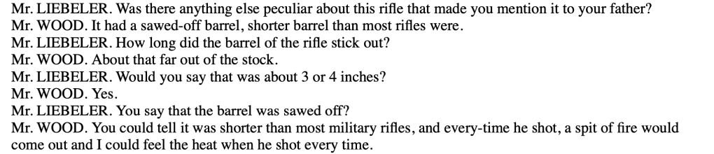 Now, there is an added bonus to the testimony of young master Wood. He and his father both notice that LHO’s rifle is spitting out sparks as he shoots. That says something given that nobody in Dealey Plaza around 12:30 PM on 11/22/63 noticed anything of the sort.