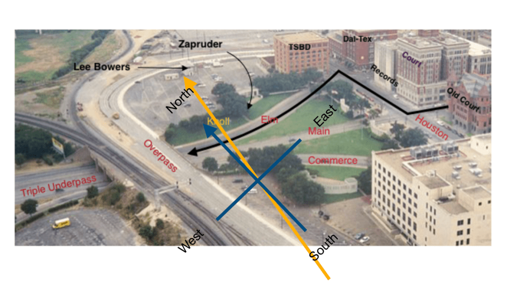 Here is the best way to view Dealey Plaza. For years, it has been represented in an orientation that is not helpful in understanding the shadows and the direction that people are traveling. Elm, Main and Commerce are running east west.