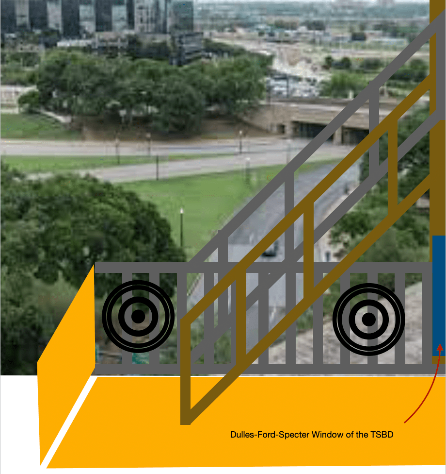 Now, this isn’t perfect, but it’s a start. The fire escape may not be accurate in the sense of a four foot extension under the riser. The spotter, not shown here, would stand behind the shooters (targets), and tap them on the back, or give a command, as he watches WTM and TA.
