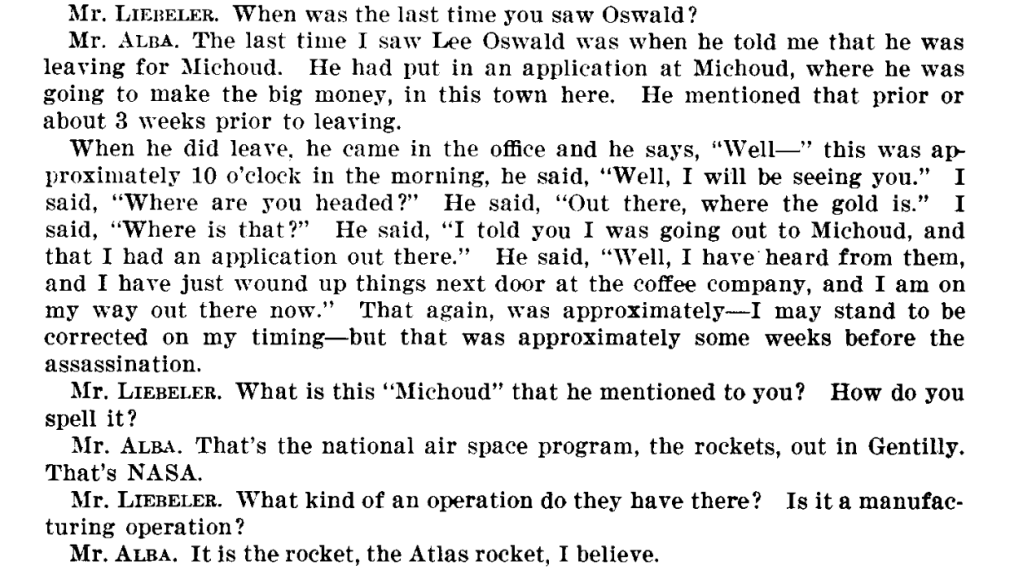 Who got him the new job at Michoud? He told Adrian Alba he got a new job. That’s what Adrian Alba said. Since the Warren defenders rely on every other piece of cockamamie testimony, why don’t they rely on this? Maybe Michoud dumped LHO’s hiring file when he decided not to work there. I’ve got to believe that LHO had every intention of working at Michoud. Since he didn’t, who changed his plans?