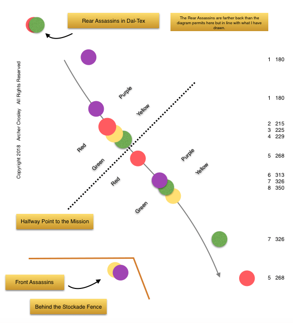 Follow the shot numbers form the left over to the colored dot to which they correspond. Shot 5 is depicted twice to illustrate the approximate position of the Presidential car and where James Tague was standing. Shot 1 is depicted twice to illustrate the approximate position of the Presidential car and where the bullet probably landed. Shot 1 was a miss. Technically so was Shot 5. Shot 7, another miss, is depicted twice to illustrate the approximate position of the Presidential car and the manhole where the bullet landed.