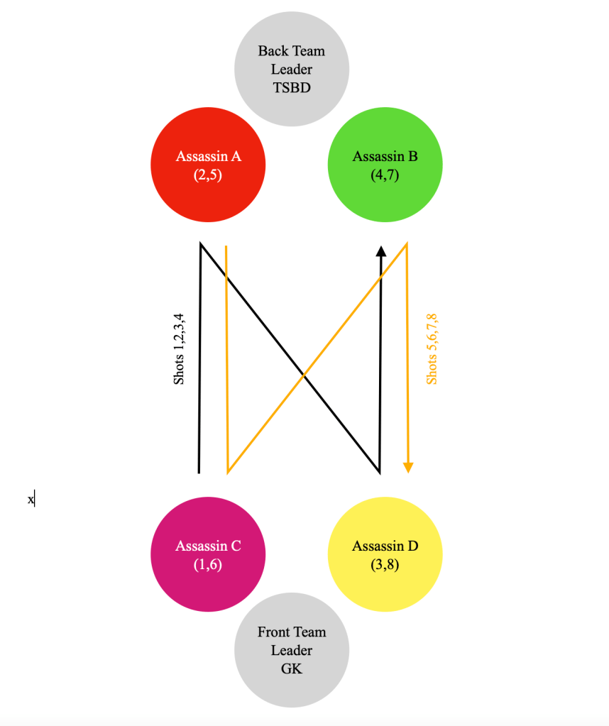 Before the break point, Back Team leader is watching PB (Walkie Talkie Man). When PB raises his arm, he taps Assassin A on the flank. When PA lowers his arm, he taps Assassin B on the flank.