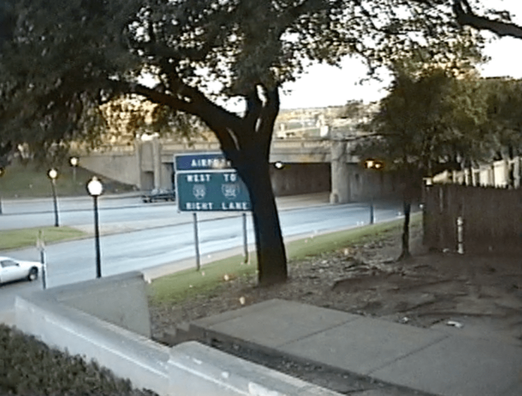 Here is the view that Zapruder had. This is a screenshot form a video I took in the early 90s. I am standing on the pedestal where Zapruder stood. At 6’2″, I am approximately 8 inches taller than Zapruder.