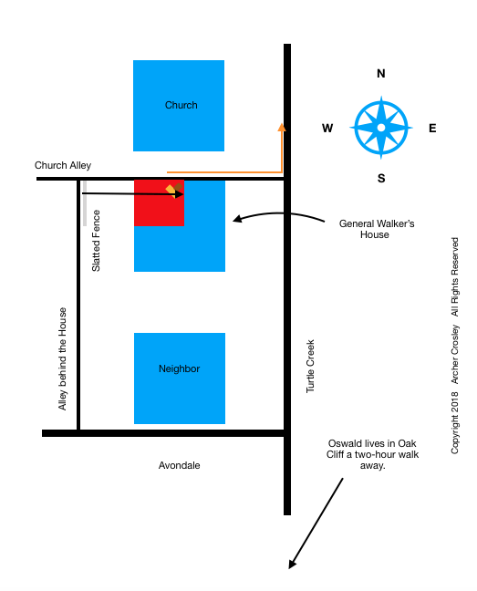 Here is a map of the Walker Residence. It is not drawn to scale. The yellow arrow represents the car that General Walker saw leaving after the shooting. Oswald did not drive. The black arrow represents the approximate line of the bullet. General Walker was sitting in the corner behind a desk that was looking into the center of the room. He was doing his taxes when a shot missed his head to his left. He initially thought a screen had come loose from the window. The police determined that a shooter had taken a shot from the alley around 80 feet away. They felt that there was no possible way the shooter could have missed. Maybe the shooter wanted to miss. Apparently the bullet hit the sash in the window and deflected. How about that? Another magic bullet.