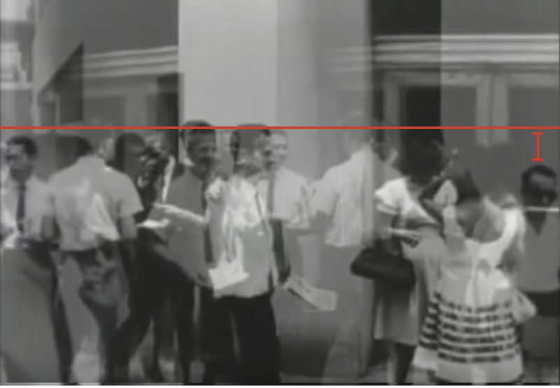 Finally, what I am trying to do in this next sequence of photos is to try and match the heights of Lee Oswald and the man in question. I tried to pick a point in the wall where they were both crossing just before they got to the women. Then I superimposed the photos. Photometric analysts can do a more precise calculation. I probably should have snapped the picture of the man in question a few frames earlier, but I don’t think it will make too much of a difference. Notice that Lee Oswald is almost a full head taller than the man in question.