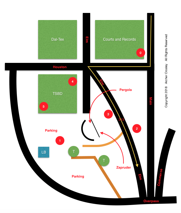 0: He is standing around watching the parade as the shots rings out at 12:30 PM.