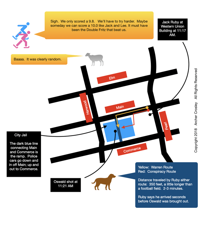 Jack Ruby, according the Warrenatti, walked down Main to the Main Street ramp, then slipped past a police officer who was assigned to guard the ramp. Much testimony and debate has been registered about which route Ruby took, but we need not rely solely on testimony. Jack Ruby would not have taken the Main Street Ramp because Jack Ruby was not able to look into the future. Jack Ruby didn’t know who was on that ramp. All he knew was that he had to get to a certain point at a certain time, which is why he would have taken the secure route, the route through the back, unless, of course, the Warrenatti are willing to posutlate that indeed Jack Ruby DID know who was on that ramp. Of course, Jack Ruby also didn’t know if the alternative route was being guarded by police; or did he? Frankly, it’s irrelevant which route he took; he got there with impeccable timing – that is what is important.