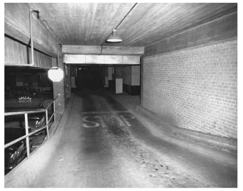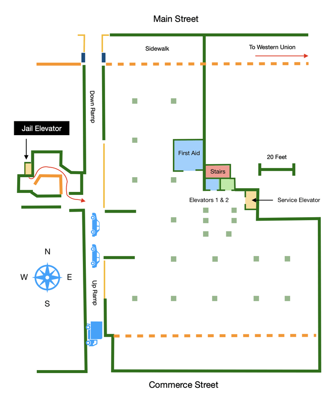 To the east of the ramp is the police parking area. It is an L-shaped garage. Oswald was brought down the jail elevator to the west of the ramp. Ruby could have gotten access through any of the stairwells or elevators to the east of the ramp. These access points were reportedly guarded. Normally cars would access the garage by going down the Main Street ramp (top); they would egress up the Commerce Street ramp (bottom). The curved red arrow above is Oswald’s route to where he was shot by Jack Ruby.