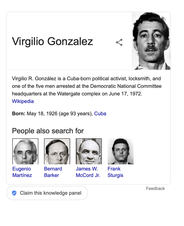 If so, this would be important because it give us a clue as to who the man next to him is. They must be good friends. The man hiding his face has his arm around him. Is it SB? Well, SB was stationed in the White House by Richard “My boyhood friend is Ben Bradlee” Helms as the Watergate affair was going on. Maybe SB went in there to snoop around and hook up with his old friend Virgilio who was one of the Watergate burglars.