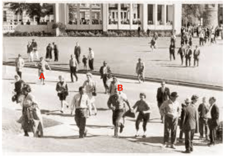 One of the problems in identifying the Babushka lady is a) there are probably some photoshopped pics of the Babushka lady out there on the internet, and b) there are at least two women walking across Elm in the aftermath of the assassination who could be the Babushka lady. See below. A and B.