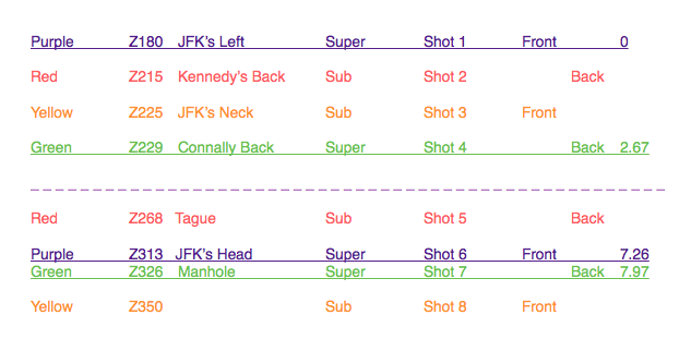 You will notice in the above scenario that shots 1, 5 and 7 are depicted twice. This is because I wanted to demonstrate the sequencing of the shots plus their approximate point of impact. Shot 5 may have gone through the limo windshield to strike the Main Street curb and then James Tague. Shot 8 at Z350 missed and either buried itself in the ground or the Presidential limo.
